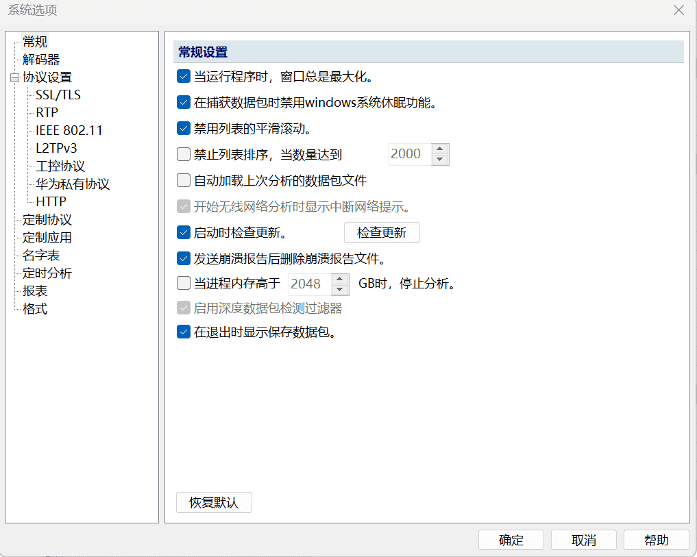 上面是系统选项的全部介绍,除“深度数据包检测工具”需提前做好选择外,其余保持默认配置即可满足大家95%以上的分析场景。