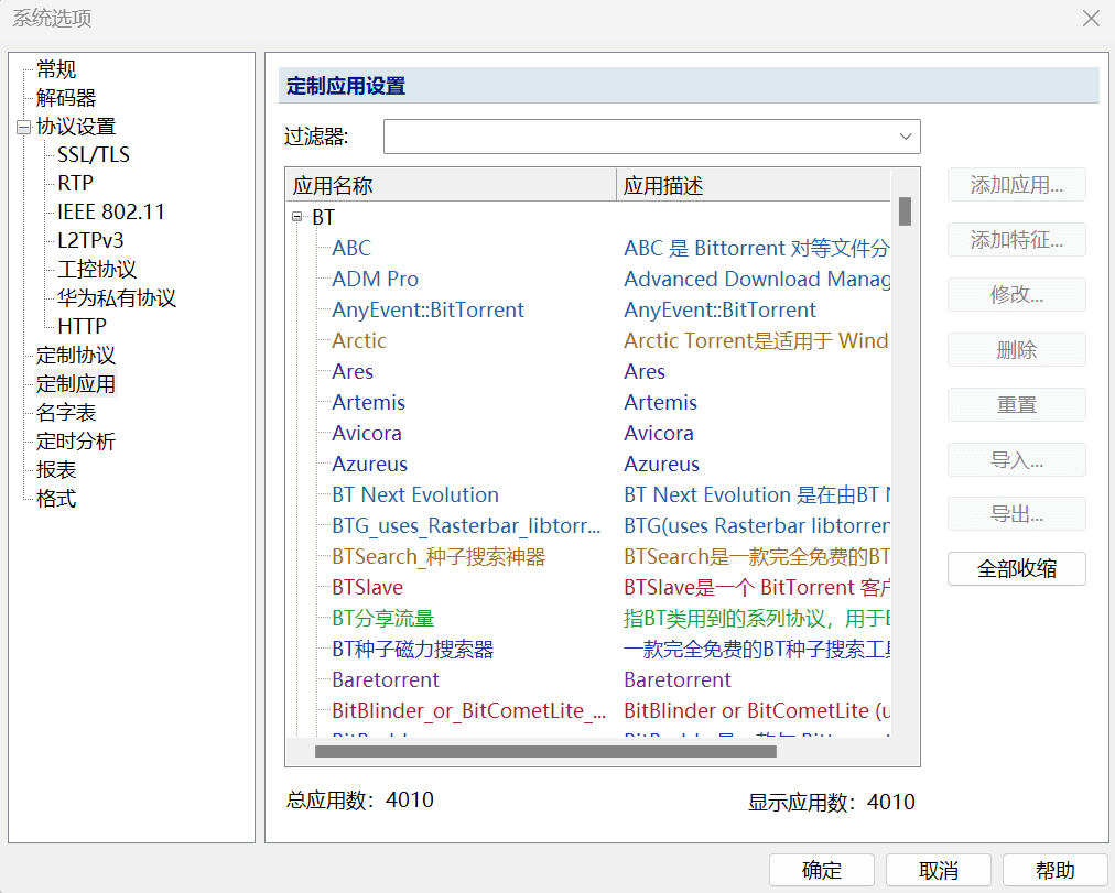 定制应用位于“系统选项”菜单中,主要是用来帮助用户自定义一些特殊的应用,当数据包满足相应配置特征时,会在“应用”栏中显示,如下图6: