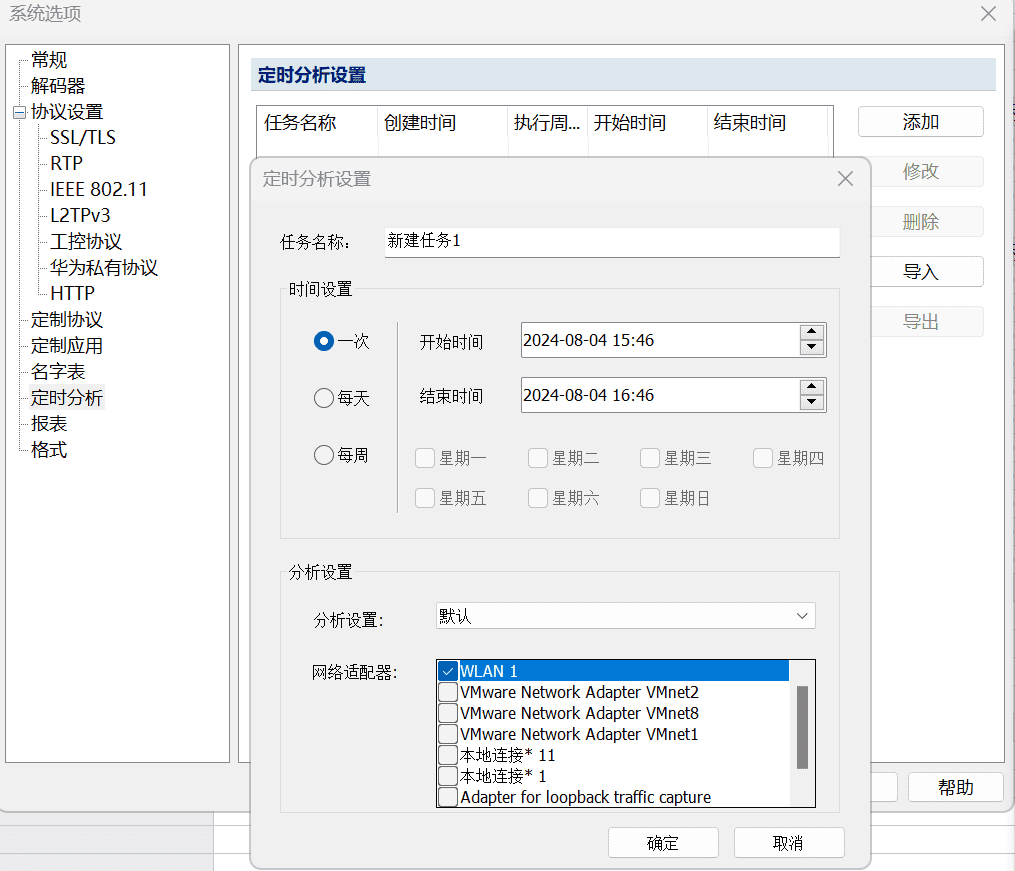 如果需要捕获某个特定时段的网络通讯数据包,您可以定时分析功能添加定时分析任务,当到达指定时间,系统自动开始数据捕捉,如下图7: