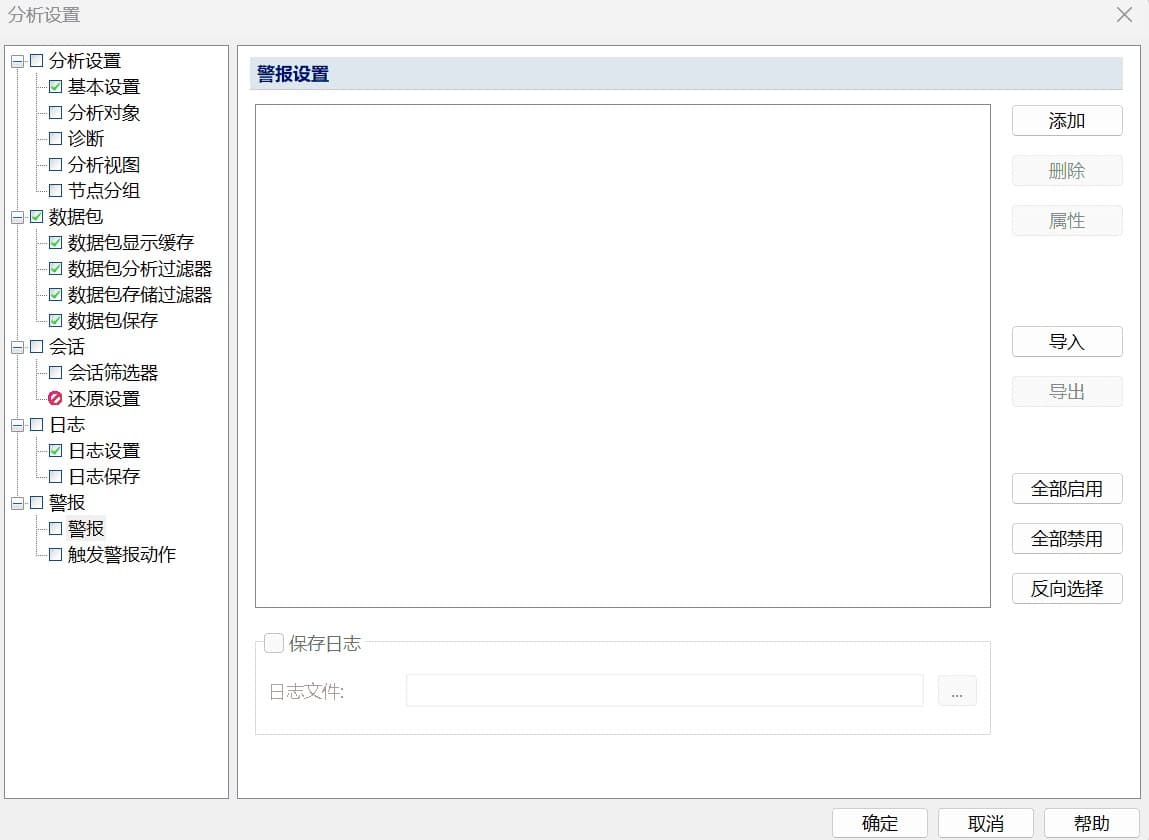 警报对话框中显示了您创建的所有警报信息,可以启用、禁用或者编辑修改警报条件,并可以进行导入/导出操作。此外,可以设置自动保存警报日志,当警报触发时,会根据您的设置自动保存触发警报时的相关信息,如图15: