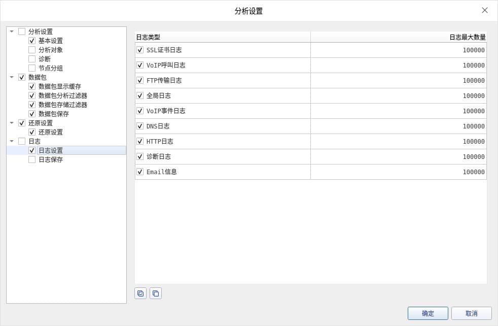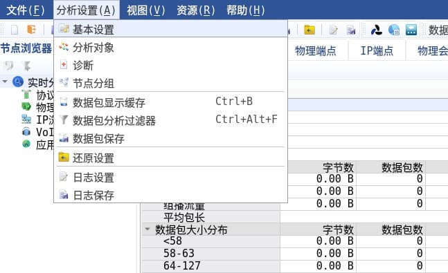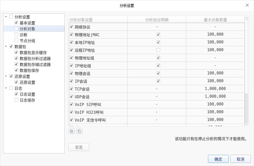 说明:数字设置越大,将会更消耗主机性能。但如果实际数据包中的指标数量超过设置的上限,将会出现“分析页面空白”不显示的情况(一般可能出现在分析特别巨大的数据包情况下,此时应增大分析缓存和分析对象的数目)。