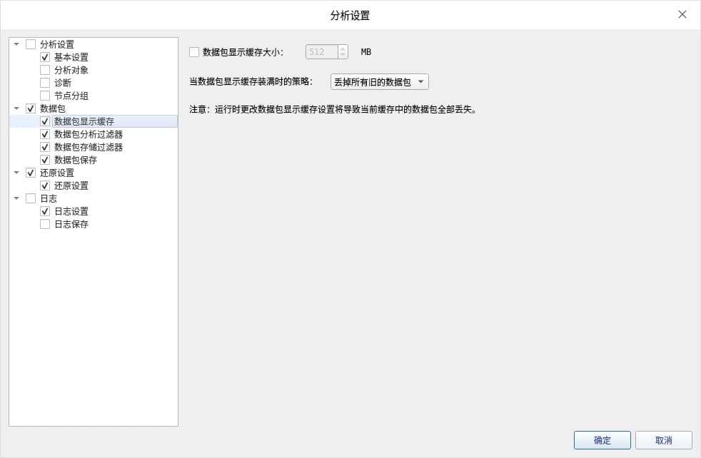 说明:缓存日志的大小空间可以调整,分析特大型数据包时,才需要调整。