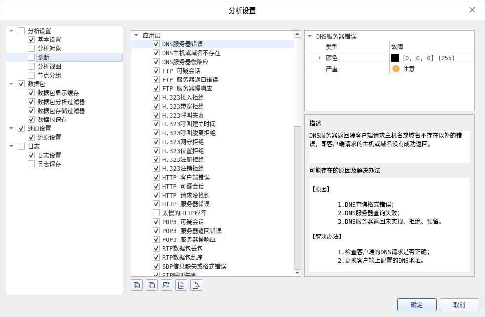 诊断设置中,本系统支持的所有诊断事件均以树形结构展现给您查看。所有的诊断事件都是以协议层来分类,即:应用层、传输层、网络层、数据链路层。这样我们对于网络出现的故障,我们便能很快判断出是网络的哪一层出了问题。如下图6: