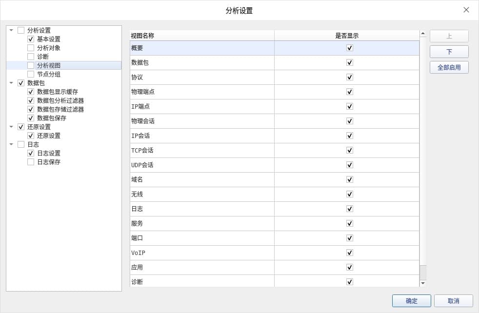 不同的分析方案,其分析主视图有所不同。系统默认有多种主视图区用于网络统计、分析及诊断数据的输出显示,用户可以根据使用习惯自定义开启/关闭视图显示或调整视图显示顺序,如下图7:
